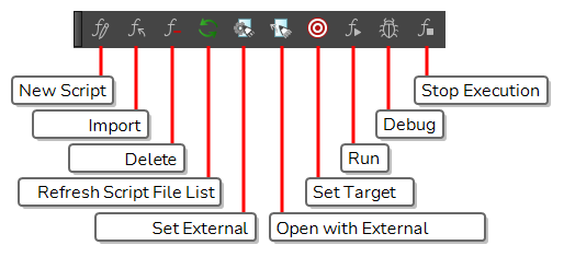 • You cannot link an entire script to a toolbar button. Only functions within scripts can be added as toolbar buttons. Therefore, running or debugging an entire script rather than one of its functions should be done for testing purposes only.