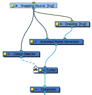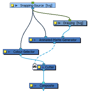 This creates a similar template to the one created by the Add Matte Generator button, except that the Animated-Matte-Generator node created by this option is connected to the matte port of the Cutter node, and the Colour-Selector node connected to the selected layer is connected to the input port of the Cutter node.