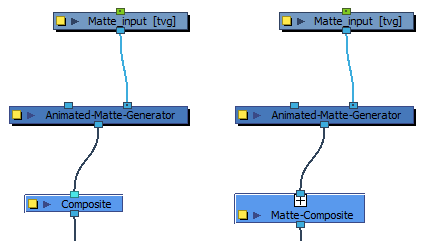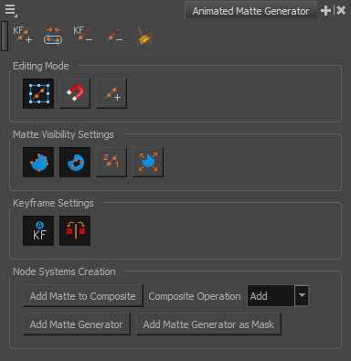 If a Composite or Matte-Composite node is selected in the Node view, this creates an Animated Matte Generator template with an empty matte drawing layer in the Node view, then connects the newly created Animated-Matte-Generator node to the selected composite.