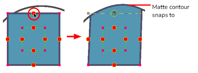 Points and contours that are configured to snap will snap to the closest point or contour they can find in the snapping source, provided that they are at a reasonable distance from their actual coordinates. This distance can be adjusted by changing the Drag-to-Snap Distance parameter in the Animated Matte Generator's layer properties. |
