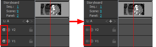 It is also possible to simultaneously hide or unhide all video tracks that appear over your storyboard and all video tracks that appear behind your storyboard.