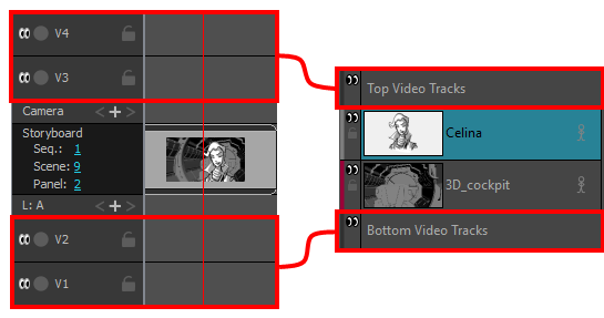 - If you have one or more video tracks above the storyboard track, a Top Video Tracks layer will be on top of the list.