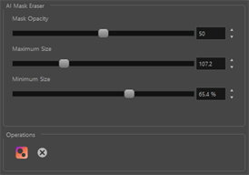 In the Tool Properties view, you can adjust the eraser size and opacity of your strokes. The Maximum Size will dictate the largest size the eraser can be when applying pen pressure. The Minimum size will dictate the smallest size of the eraser when applying less pen pressure. To adjust the opacity, you can use the Max Opacity slider.