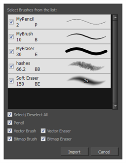 - By default, the presets for any tools included in the file will be selected for import. If you only wish to import presets for specific tools, uncheck Select/Deselect All and select the tools for which you want to export the presets