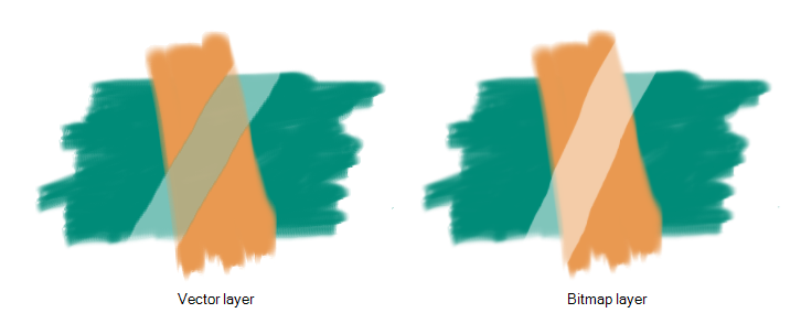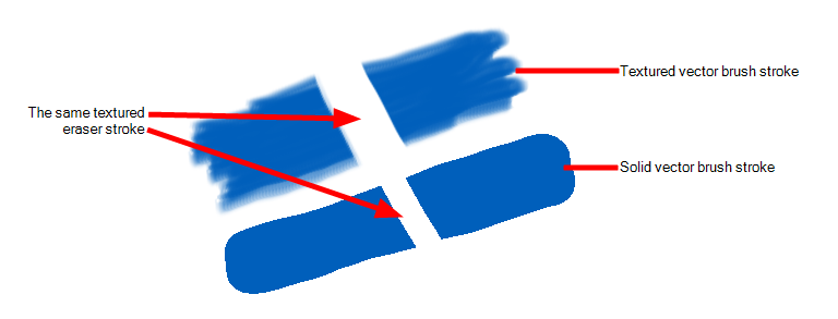 Another issue you might encounter when erasing textured vector artwork is that textured vector brush strokes are not flattened together, whereas on bitmap layers, your artwork is always flattened. This implies that if you use a semi-transparent eraser on textured vector artwork, and the artwork has overlapping strokes, all the strokes you erase will become semi-transparent, the resulting image will be a composite of the overlapping strokes. On a bitmap layer, this would simply result in a single layer of semi-transparent artwork.