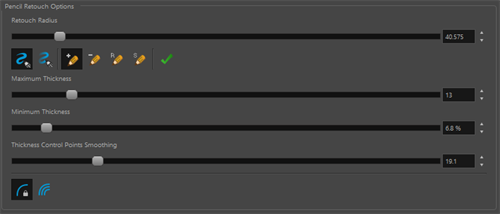 is a pressure sensitive brush that allows you to make adjustments to the pencil strokes in your scene. Using the Pencil Retouch tool, you can increase or decrease the thickness and/or opacity of your strokes. This tool will follow the centerline of your pencil strokes in order to affect the thickness and/or opacity of your pencil strokes. Any adjustments made using this tool can be made incrementally or applied to all selected strokes. You can also use this tool to smooth out varying line weights and/or transparencies.