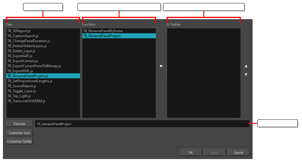 The Scripts Manager dialog allows you to create buttons in the Scripting toolbar. Each button you create can run a specific function in one of your scripts. You can also choose an icon and a tool tip for the button, if you want.
