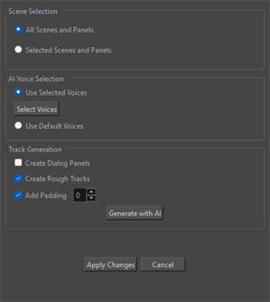Once you click Generate with AI, your panels will be processed by the AI. When the process is complete, each panel will be timed based on how long the AI believes it will take to convey the dialogue. If the Create Rough Tracks is selected, each character will get their own audio track for their dialogue. The voices that are generated are the voices assigned using the Select Character Voices operation. If you do not assign AI voices or do not want to use the Select Character Voices operation, you can opt to select Default AI voices. This option will give all your dialogue the same generic voice.