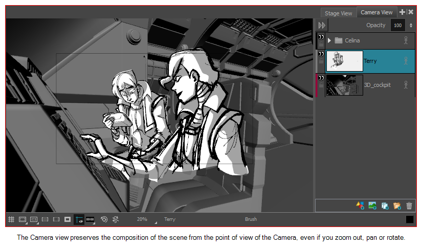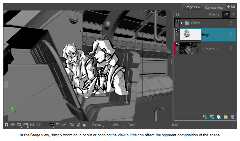 In Storyboard Pro, the Stage view is the default view in which to draw and manipulate objects. However, when working in 3D, it has one pitfall: When you pan, rotate, zoom into or zoom out of the stage view, you are changing the point of view from which you are looking at the stage. This means that the apparent position and size of elements may not be representative of what will appear in your storyboard