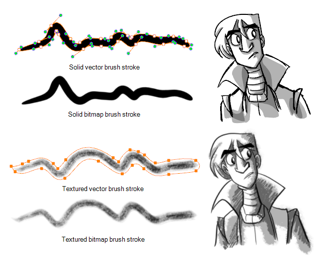 layers. In either case, the Brush tool can be made to create solid or textured brush strokes with almost the same capabilities. The main difference is that, on bitmap layers, your brush strokes are fully bitmap, and are always flattened into the canvas, whereas on vector layers, your brush strokes are made of a vector contour with a bitmap fill, and are kept as separate drawing objects that can be manipulated individually. This has the following implications: