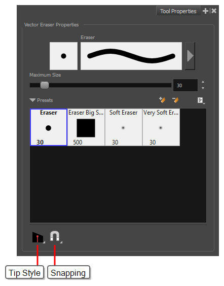 When you select the Eraser tool, the Tool Properties view displays the different modes available for this tool at the bottom.