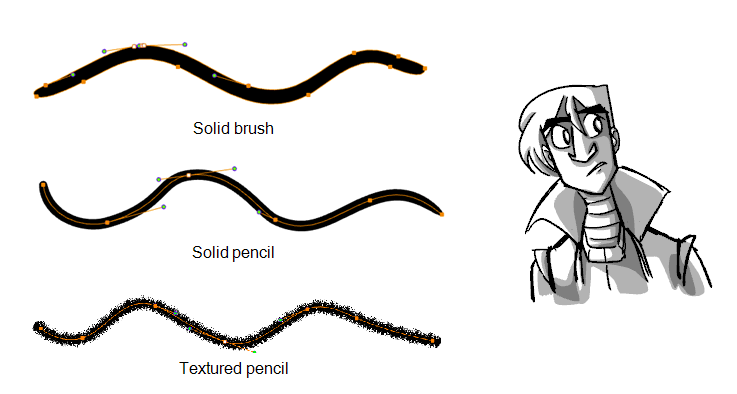 The Pencil tools support pressure sensitivity, allowing you to create lines with variable thickness, producing central vector lines of constant or variable width, making a clean line. This means that a pencil line’s control points (used to deform its shape) are located along the length of the central spine. The Pencil tool is very useful for tracing, clean or final drawings.