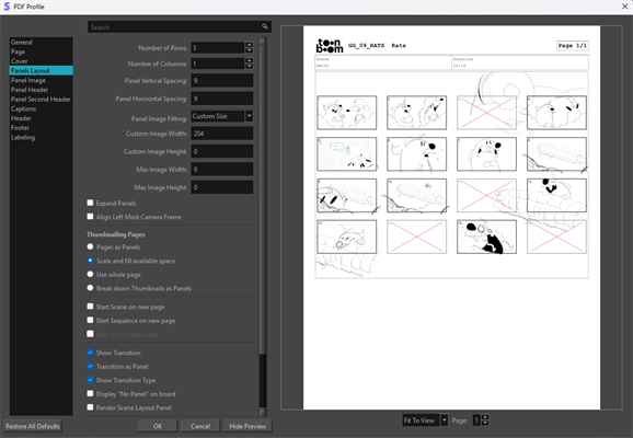 The panels in the thumbnailing view can be exported to PDF sheets. The Thumnailing Page can be exported both as a Thumbnailing Page or converted into several Scenes and Panels. You do not need to use the Convert to Panels parameter in order to do so. When exporting your Thumbnailing Page, the default will be to export one page with all your thumbnails per scene.