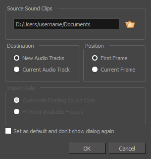 - Select the Set as default and don’t show dialogue again option if you want to use the same settings next time you need to import a sound file.
