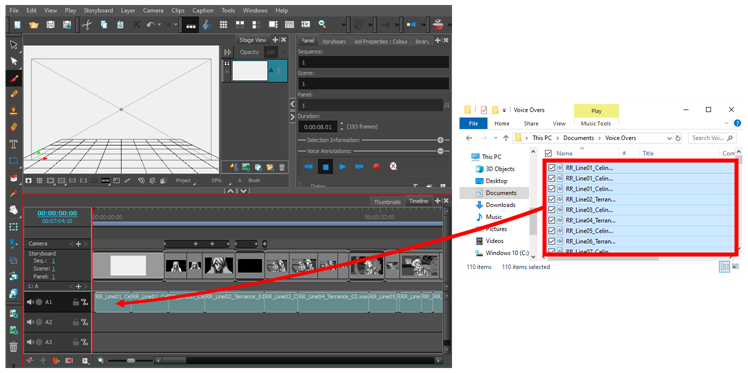 - Make sure that both the Storyboard Pro window and the Explorer or Finder window are visible.