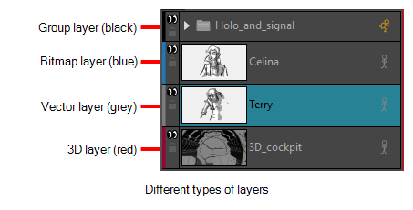 Storyboard Pro supports four types of layers: Vector drawing layers, bitmap drawing layers, 3D layers and groups.