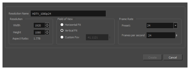 You can create a custom resolution from the Welcome screen or New Project window. Your new resolution will appear in the Camera Size menu of both the New Project window and Welcome screen.
