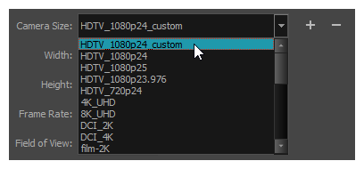 Add button right of the Camera Size drop-down to add a new resolution to the list.