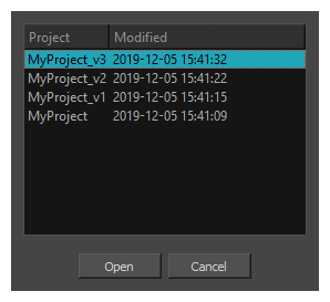 NOTEIf your project has several versions, you will be prompted to select which version to open. Select the desired version and click Open.
