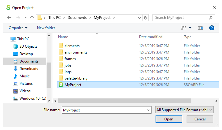NOTEIf your project has several versions, each version will be named after your project's name followed by an underscore (_) and the name of the version. For example, version "v3" of a project named MyProject would be named MyProject_v3.sboard.