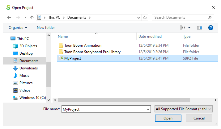 Storyboard Pro Packed File, it will be a single file named after your project name, with the .sbpz extension.