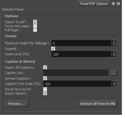 This option is enabled by default. All captions from this panel will be exported to PDF. If you want to select specific captions to export, deselect this option and use the Caption List option to make your selections. |