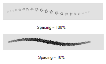 Defines the amount of space between each stamp of the brush. A value of 100% sets the stamp marks edge to edge, if there is no white space around the shape. The larger the value, the greater the space between marks. A really large value can make the brush stroke appear as a string of individual marks. Conversely, a small spacing value will give the appearance of a fluid brush stroke.