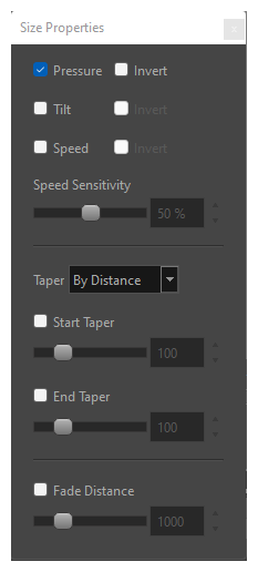 • Speed: Allows you to reduce the size of the stroke by drawing at a fast speed. You can check the box to invert this behaviour.