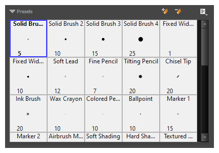 • Stroke View: Displays presets in a list, with their name and a preview of a stroke done with each preset.