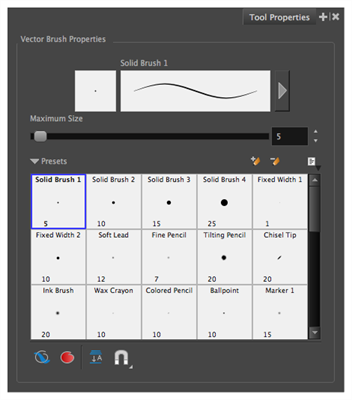 • Solid Vector Brush: Creates vector shapes filled with a solid colour. Makes artwork lightweight, scalable and easy to tweak. Since this kind of brush can only create solid colour shapes, solid vector brushes have a limited set of options including size, roundness, angle, centerline smoothing and contour smoothing.