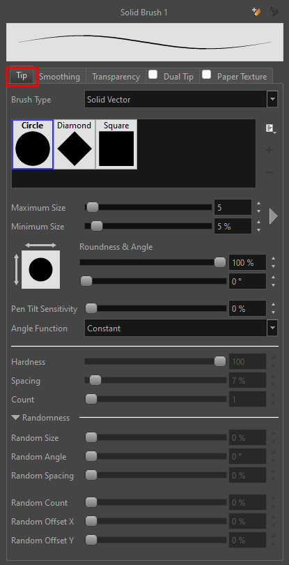 The Tip tab allows you to configure the shape, size, hardness and spacing of your brush tip.