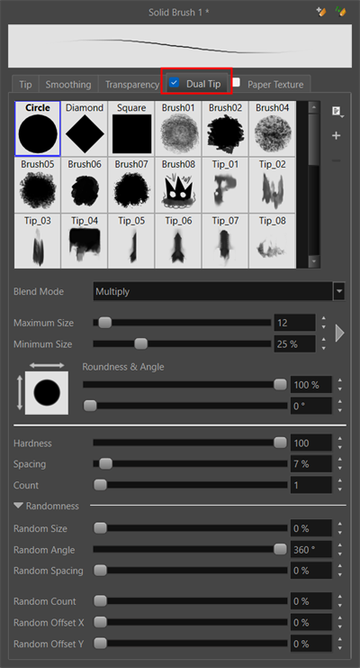 NOTE To use a Dual Tip, you must enable option by checking the checkbox inside the Dual Tip tab. Additionally, if you are working on a vector layer, the Brush Type option of the Tip tab must be set to Textured Vector Brush.