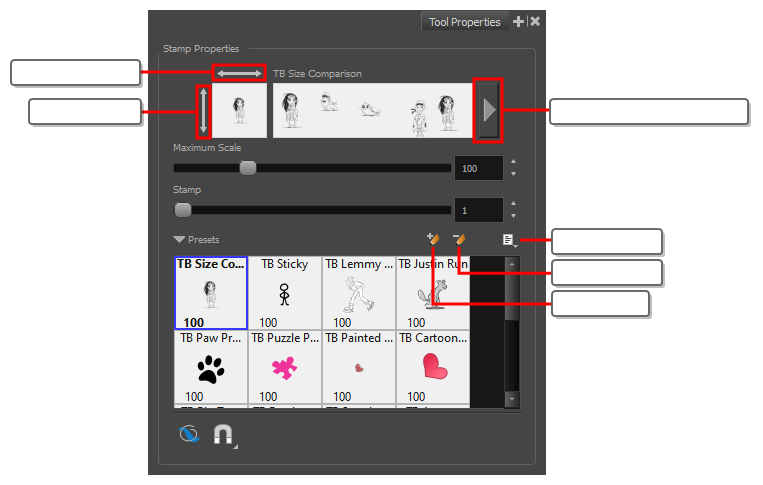 The minimum scaling factor to apply to the stamp before stamping it onto your drawing. When using the Stamp tool with a pressure-sensitive pen tablet, the size of the stamps applied onto your artwork will vary between its Minimum Scale and Maximum Scale properties, relative to the amount of pressure you apply to the pen.
