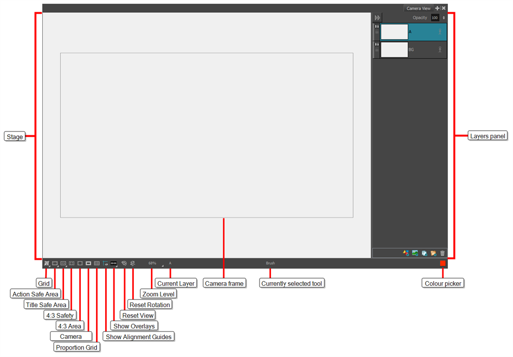 The Layer panel is where a scene’s layers are superposed to form the final image. When you import an image or draw in a panel, you are actually adding artwork to one of its layers. By default, each panel has two layers; a background layer (BG) and a foreground layer (A). As you add layers, they are automatically assigned subsequent letters in alphabetical order, but you can rename them. They are also placed on top of the selected layer or at the very top of other layers if there is no layer selected in the panel. |