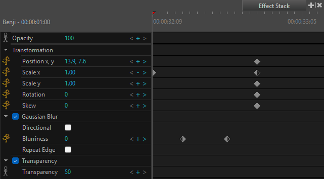 When clicked, a keyframe will be applied for the effects. See Effect Stack. To navigate one keyframe to the right, select the Right arrow. To navigate one keyframe to the left, select the Left arrow. |