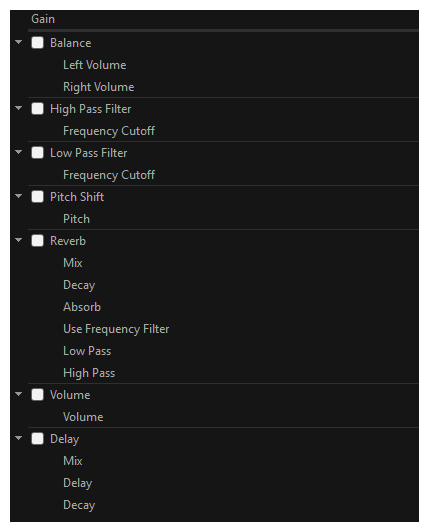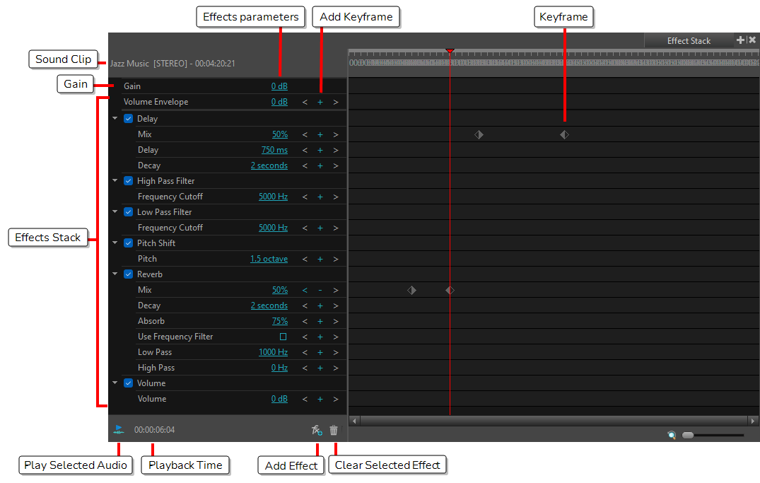 | Add Effect | Click on the Add Effect button to display a list of sound effects that can be applied to the selected sound clip. Selecting an item from the list will add this effect to the bottom of the Effect Stack. |