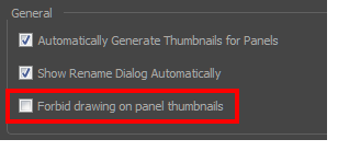 - In the General section, deselect the Forbid drawing on panel thumbnails option.
