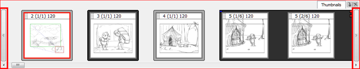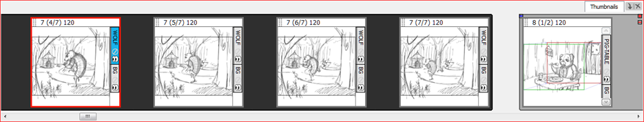 The Thumbnails View displays all the panels of your project in chronological order. You can use this view to navigate through your storyboard, rearrange panels and scenes, and select the panel to display in the Stage view.