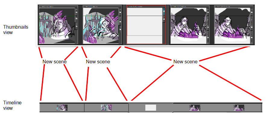 When you create a new scene, it is usually added after a selected scene, but you can make the new scene appear before it. You can also create a new scene from a series of selected panels within a scene and then separate them as a new one.