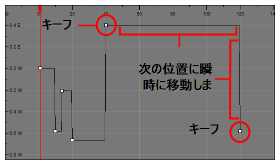 コマ撮りキーフレームではコンピューターによるキーフレーム間の補間は行われません。キーフレーム間のの関数のセグメントは一定のままで、コンピューターによるポーズ間のアニメーション生成は行われません。描画は次のキーフレームまで同じ位置にとどまり、次のキーフレームで一気に新しい位置に移動します。