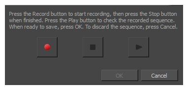 Record Voice Annotation(音声注釈を録音)ダイアログボックスでは、コンピュータとStoryboard Proに接続されているマイクを使って音声注釈を作成できます。