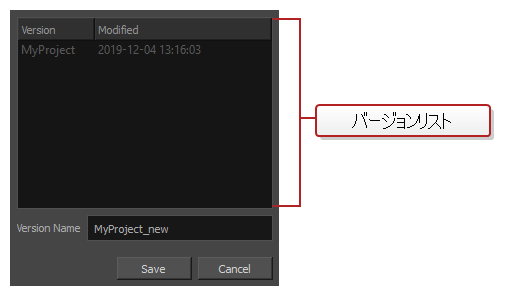 Save Version(バージョンの保存)ダイアログボックスでは、プロジェクトの複数のバージョンを保存したり、不要となったバージョンを削除することができます。