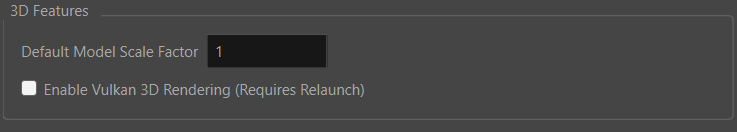 メモ グラフィックスカードがVulkan 3Dレンダリングをサポートしていない場合は、環境設定を無効にしておくことをお勧めします。重要 Vulkan 3Dレンダリングが有効な場合、インポート時にFBX形式に変換するオプションが使用できなくなります。