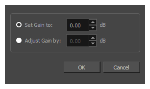 Audio Gain(オーディオゲイン)ダイアログボックスでは、一つまたは複数のサウンドクリップにおけるゲイン効果を設定または調整することができます。