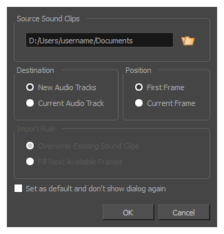 - Target Frame(ターゲットコマ)セクションで、サウンドクリップをオーディオトラックのFirst Frame(最初のコマ)に追加するのか、タイムラインカーソルが置かれているCurrent Frame(現在のコマ)に追加するのかを選択します。