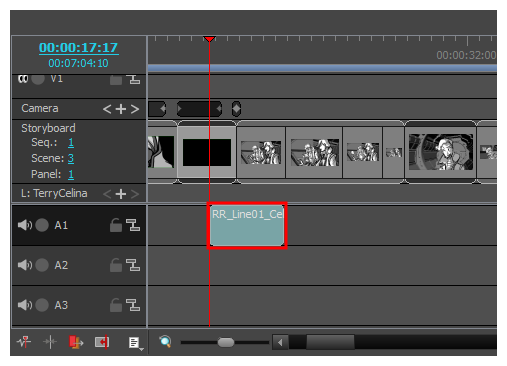 音声トラックは先頭フレームまたは現在のフレームにサウンドクリップ(.wav、.aif、.aiff、.mp3)を取り込むことができます。プロジェクトに音声クリップが存在しない場合、Storyboard Pro が現在の場所からコンテプロジェクトフォルダ内のaudioフォルダにファイルがコピーします。この操作は、Timeline(タイムライン)ビューで行う必要があります。