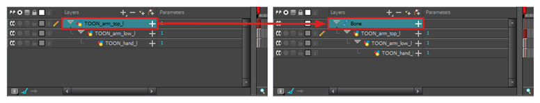 例如,如果您希望为手臂创建变形器,而手臂细分为若干图层,则可以在层级中绑定手臂。在此层级中,上臂是根,前臂是上臂的子级而手是前臂的子级。 然后,如果在上臂创建变形器,它将创建为上臂的父级,因此影响整个手臂。