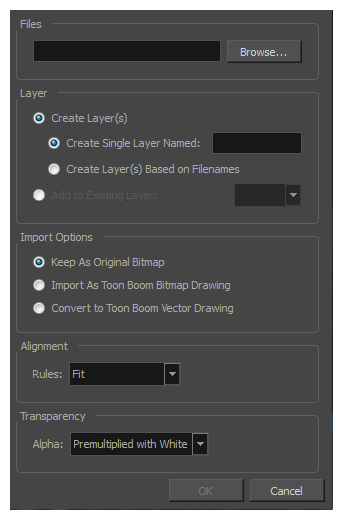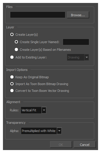 导入位图图像时,必须决定 Harmony 如何处理该图像。 可以在以下选项之间选择:
