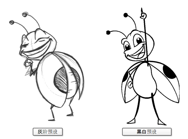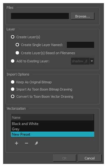 • Import as Toon Boom Vector Drawing(导入为 Toon Boom 矢量绘图) 将位图转换为 Toon Boom 矢量图稿,可以使用 Harmony 的矢量绘图工具来轻松对其进行着色和编辑。 导入使用其他软件扫描或创建的线稿时,这个选项很有用。