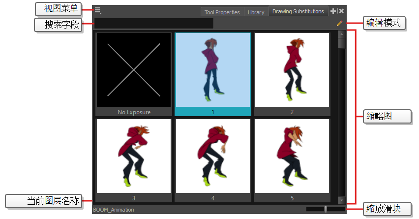 “Drawing Substitutions”(图形替换)视图允许您在缩略图列表的选定图层中查看所有绘图,也使您可以快速选择在当前帧曝光的绘图。